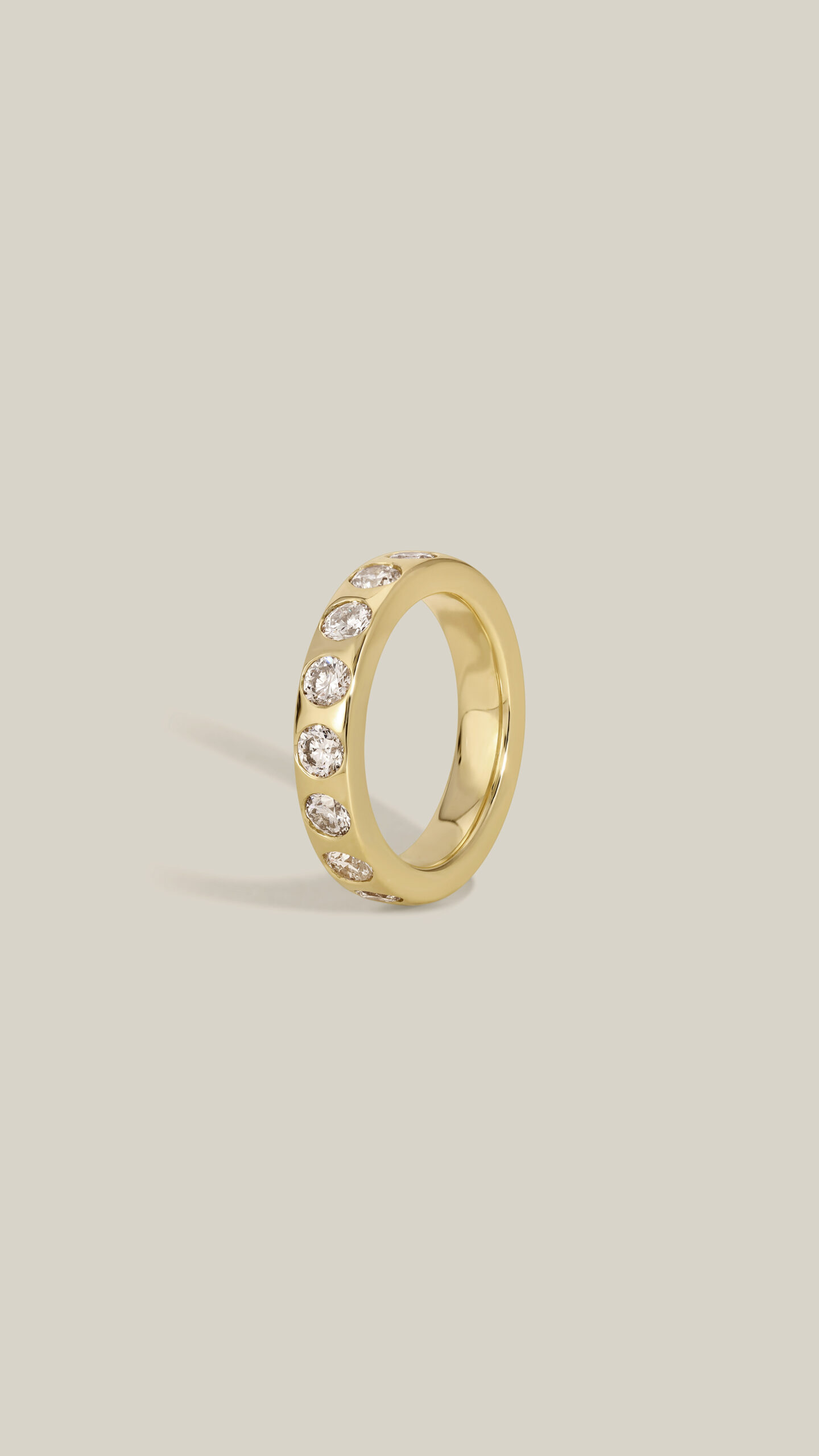 Our Gypsy Diamond band is our contemporary take on a classic infinity ring. The Gypsy set diamonds sit flush with the surrounding metal, fully adorning the band and perfectly spaced out. Designed for someone who would like to wear diamonds, but still prioritize the bulkiness of the metal.