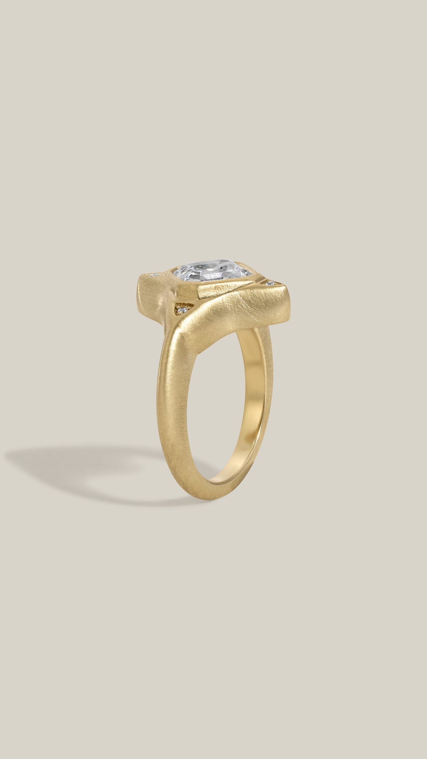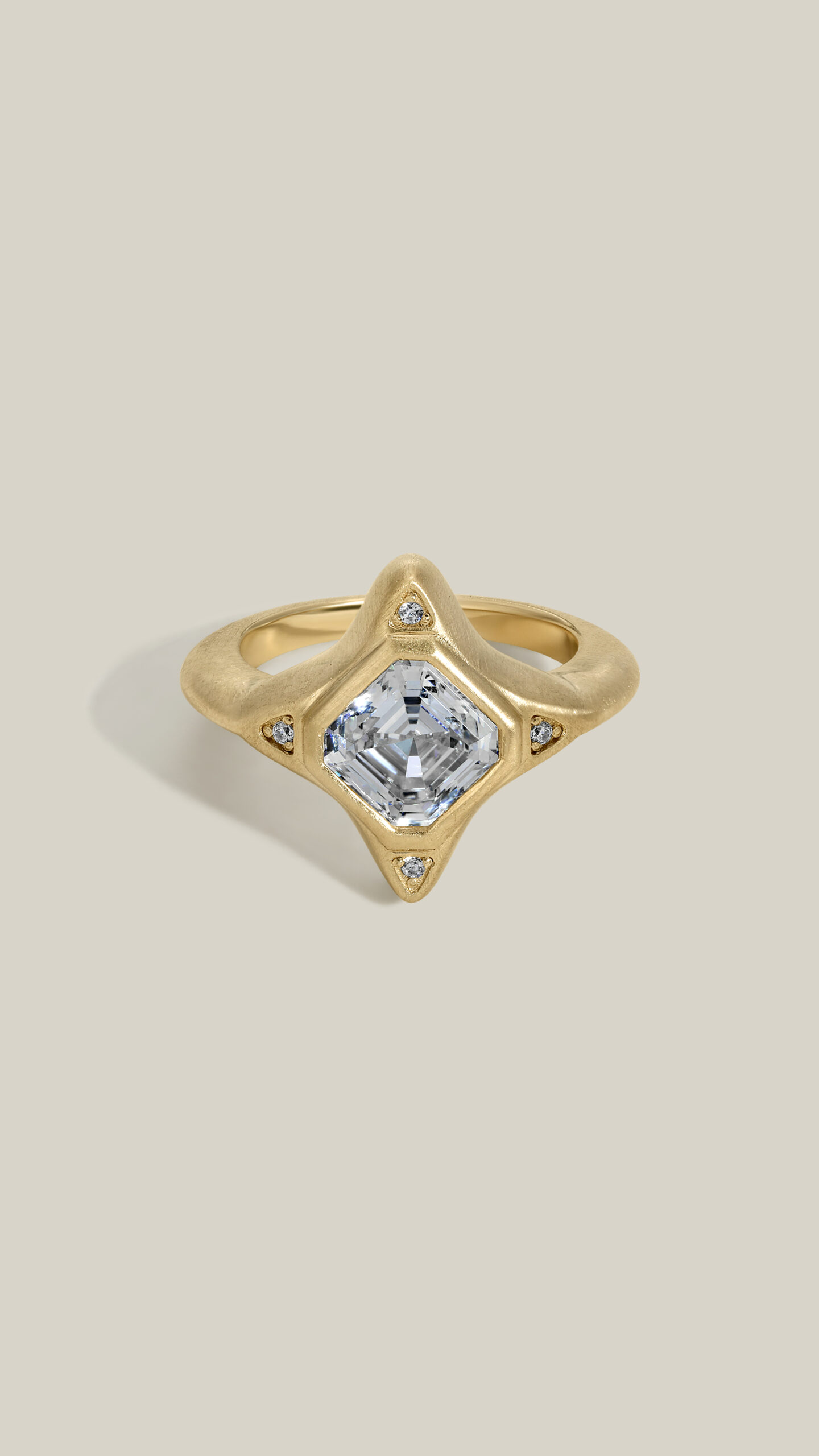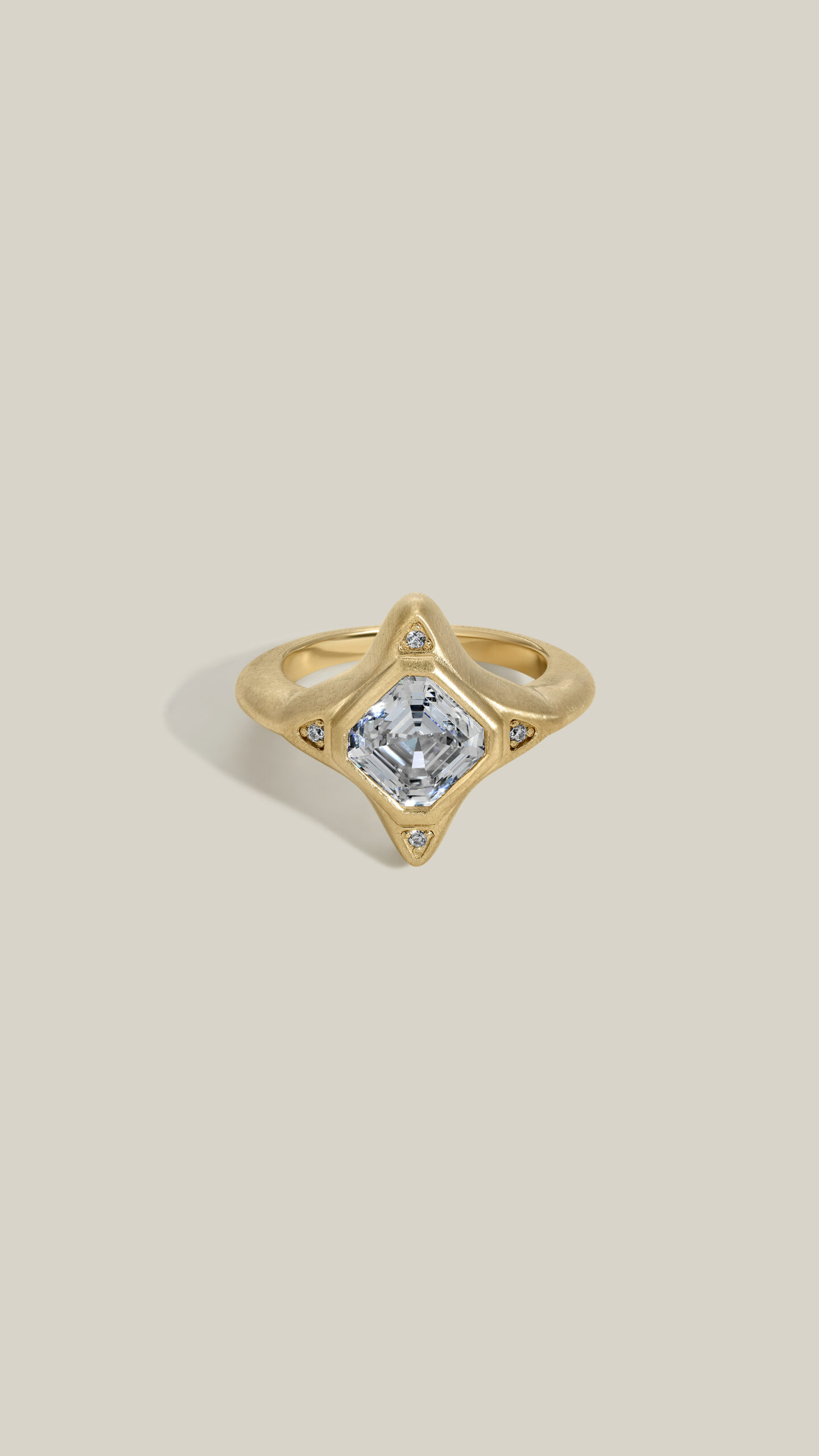 Inspired by the star that never fades, this ring honors a quiet compass for the heart. Featuring a diamond set on a gentle tilt, encircled by four smaller stones marking each direction home.